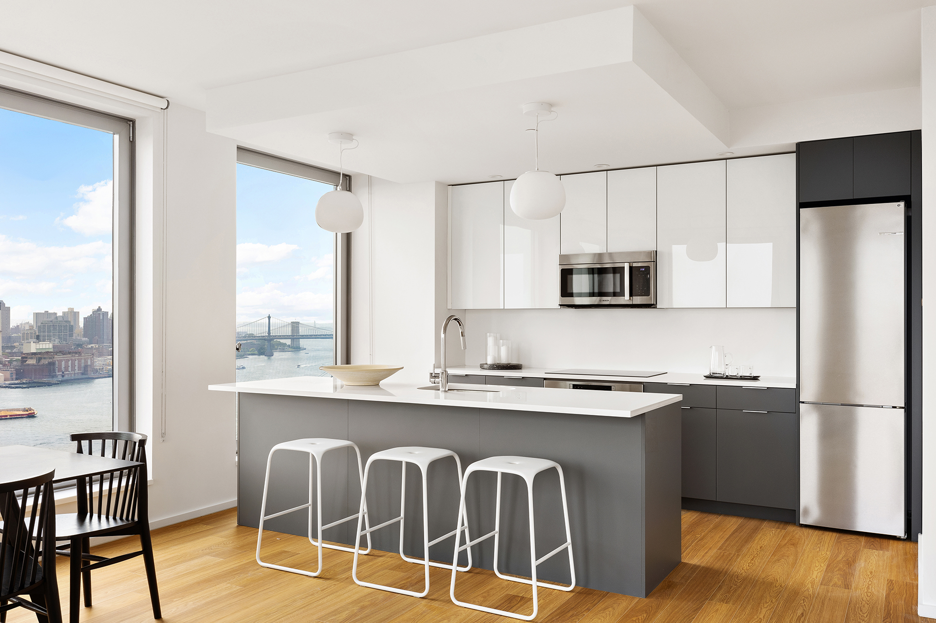 Large windows frame panoramic water and city views, offering spectacular vistas. Kitchens are crafted for culinary perfection with Caesarstone countertops and Bosch appliances. The bathrooms present a clean, sleek design and offer a spa-like retreat. Details such as washer dryers in every unit, living room and bedroom shades, dimmable LED track lighting and customized closets have been thoughtfully added for an elevated living experience.